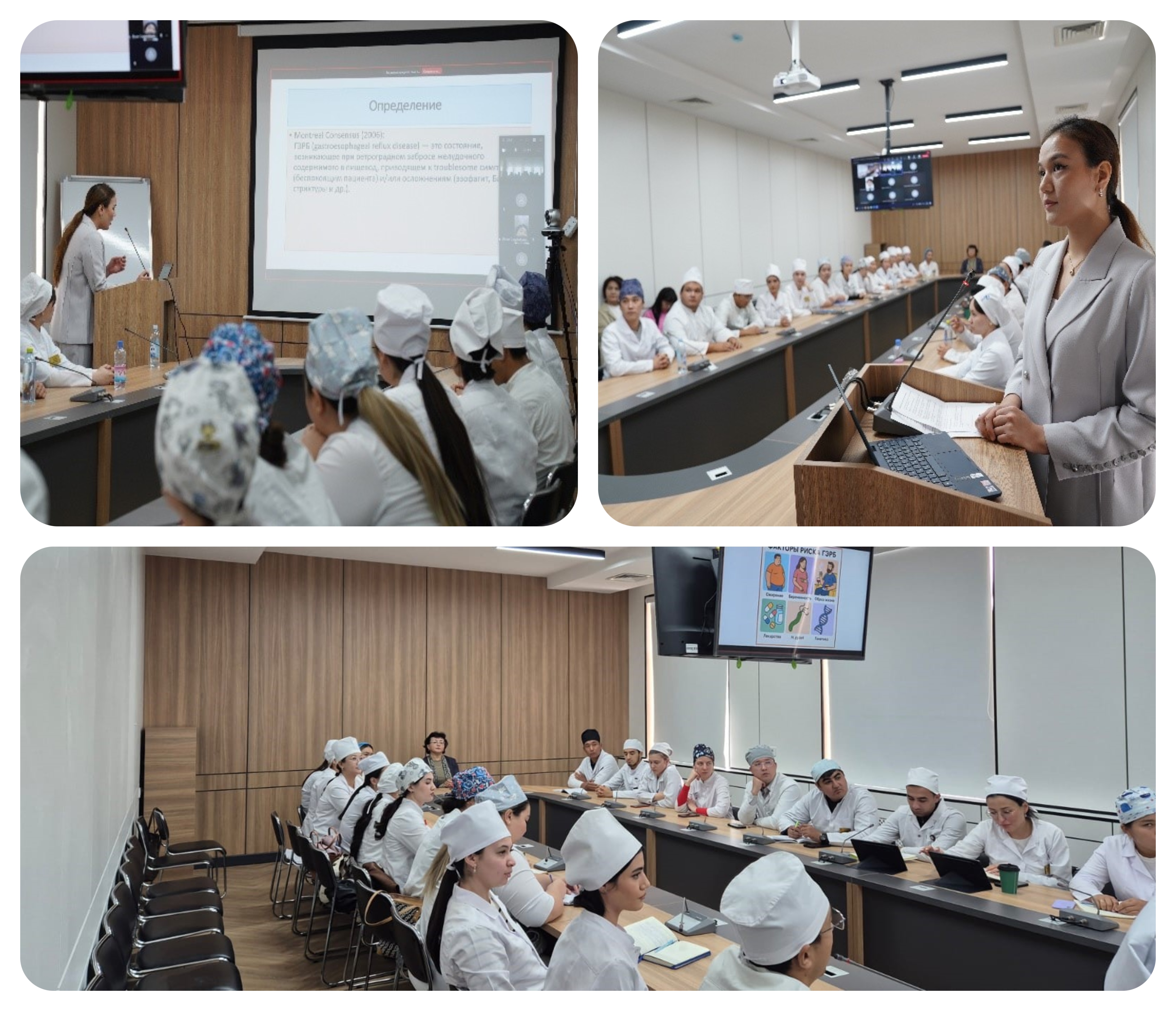 Under the scientific supervision of the Master of Medical Sciences of the Departciences-2 R.A. Smetova, an intern of group IGPIK-21-25, Akerke Ubaidina, presented a report on the “Etiopathogenesis, Epidemiology, and Classification of GERD”.