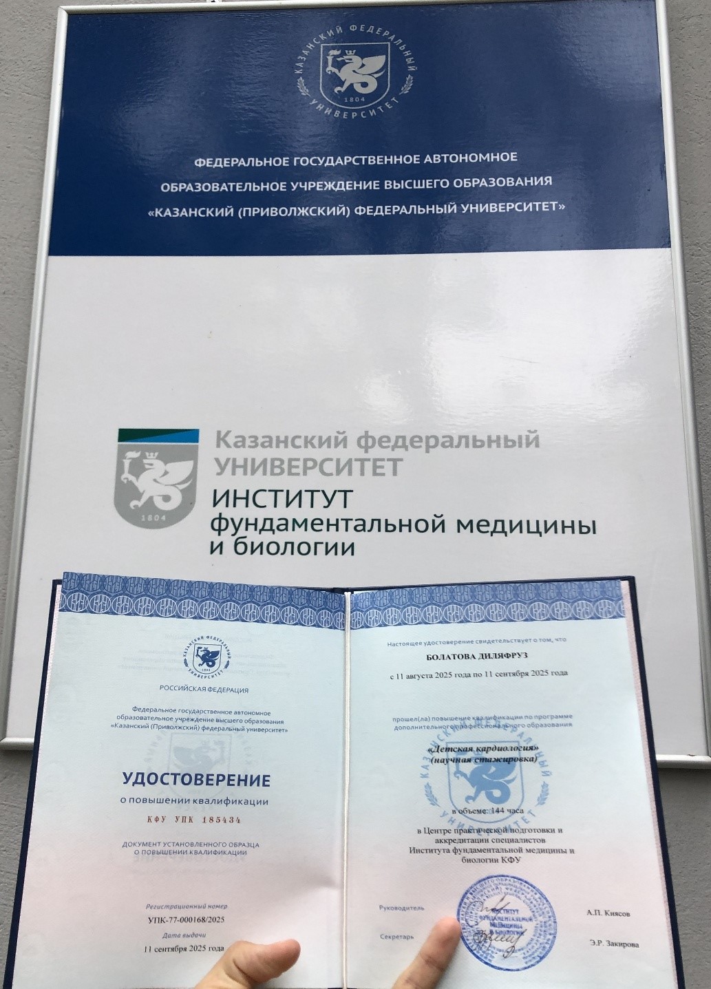 During her stay in Kazan, Bolatova examined patients in the departments of pediatric cardiology, pediatrics, and ultrasound diagnostics, collected practical research material, and discussed her dissertation project with her international scientific advisor — Dr. L.F. Galimova, Doctor of Medical Sciences, Head of the Ultrasound Department, physician in functional diagnostics at the Children’s Republican Clinical Hospital of the Republic of Tatarstan, and lecturer at the Department of “Clinical Diagnostics with a Course in Pediatrics”.
