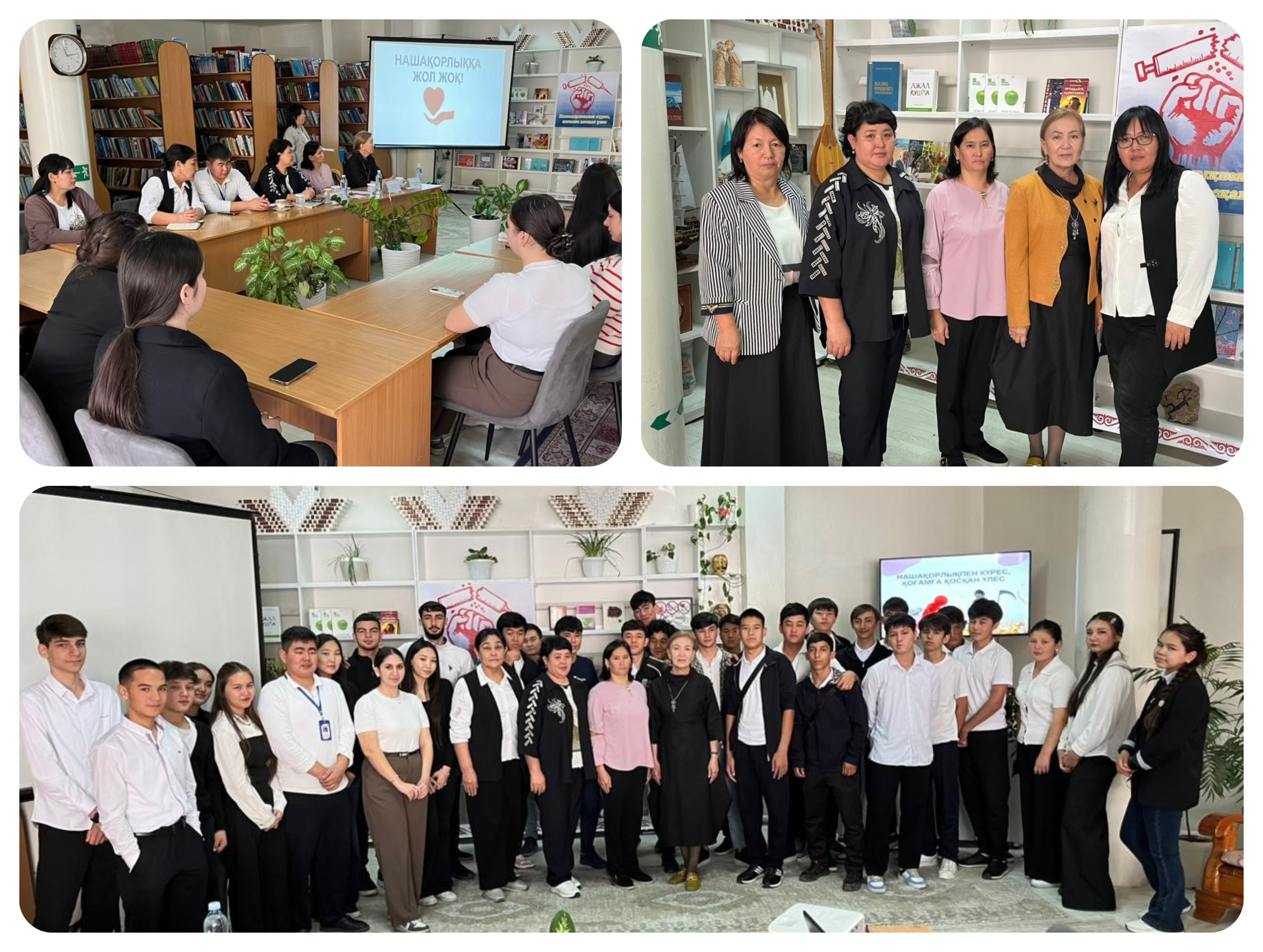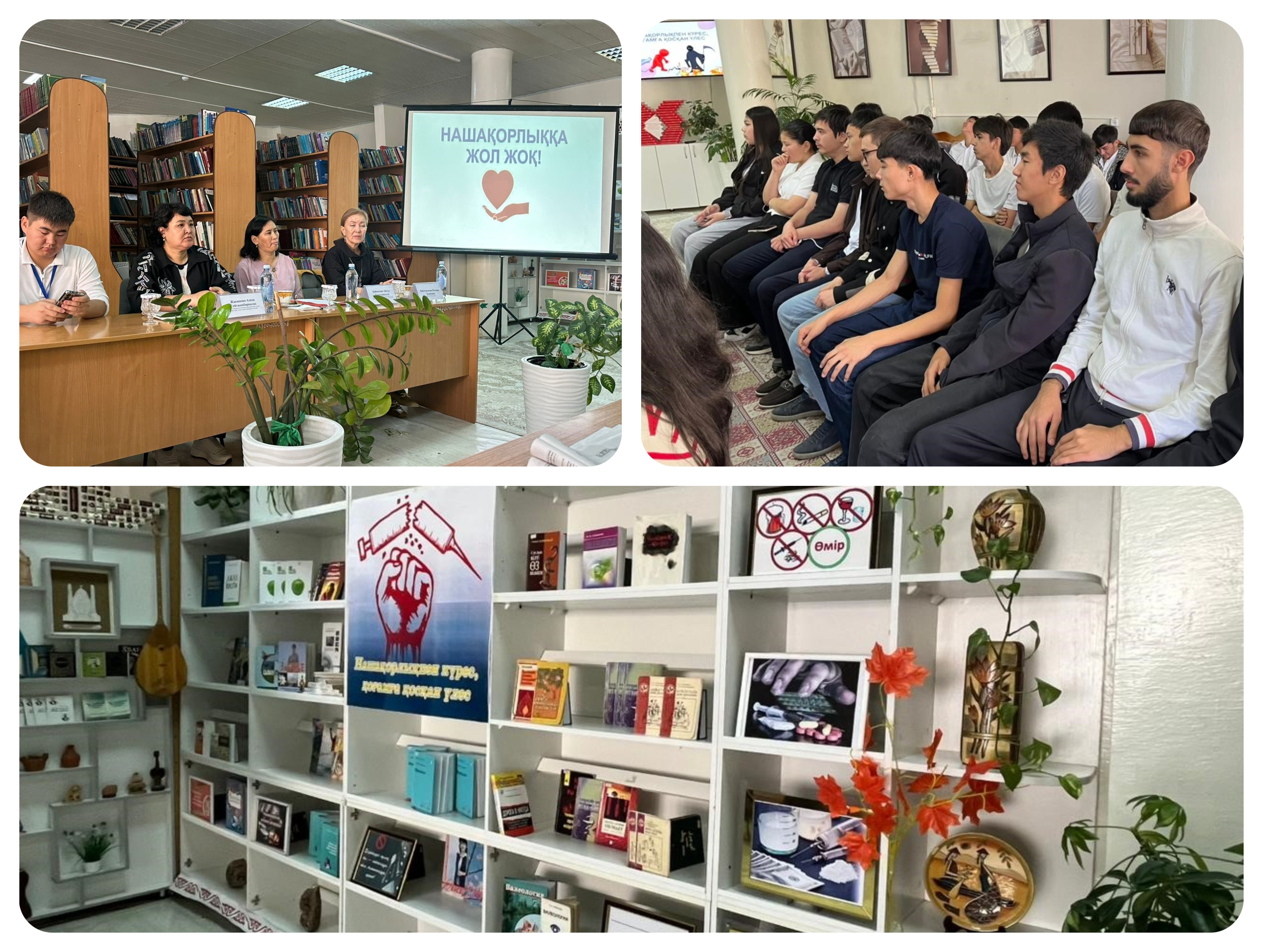 On October 7, 2025, an information hour "Combating drug addiction – a contribution to society" was organized at the Shymkent City Youth Library in order to prevent drug addiction and promote a healthy lifestyle among young people and students. The event was attended by senior lecturer of the Department of Kazakh, Russian and Latin languages A. S. Zhakipova and 1st year students of the Faculty of Dentistry in –SO-10-25. The library staff explained the topic extensively and held an important conversation aimed at the spiritual and moral development of young people. During the event, participants were provided with extensive information about the dangers of drug addiction for human health, family and society and explained using specific examples. The guests of the meeting were Aigul Tleukhanovna Baykasova, a specialist from the Shymkent City Health Department and the AIDS Prevention and Control Center, Raushan Asanovna Baymurunova, a psychiatrist and narcologist, and A. S. Zhakipova, a senior lecturer. The video "Drug addiction is the disease of the Century" was shown, where students shared their thoughts on the topic. Experts conducted free interviews with young people, explained how to avoid bad habits, and gave vital advice. "A healthy lifestyle is the key to a bright future!" special attention was paid to the importance of each young person's responsible attitude to their health.