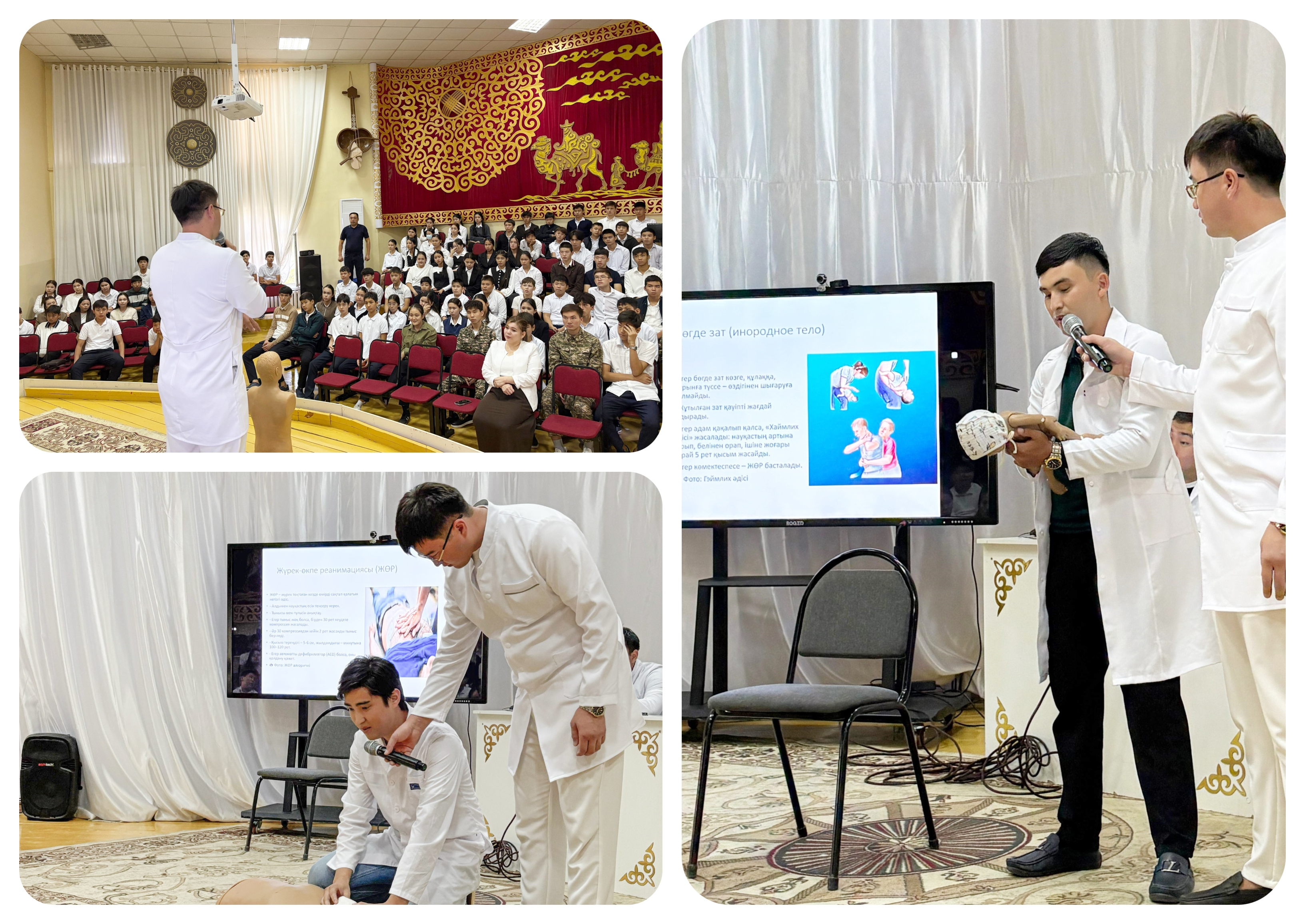 As part of the “Promoting a Healthy Lifestyle” section of the comprehensive educational plan of South Kazakhstan Medical Academy for the 2025–2026 academic year, a lecture on “Literacy – the Basis of Quality Medicine” was held for schoolchildren, focusing on the basics of first aid.