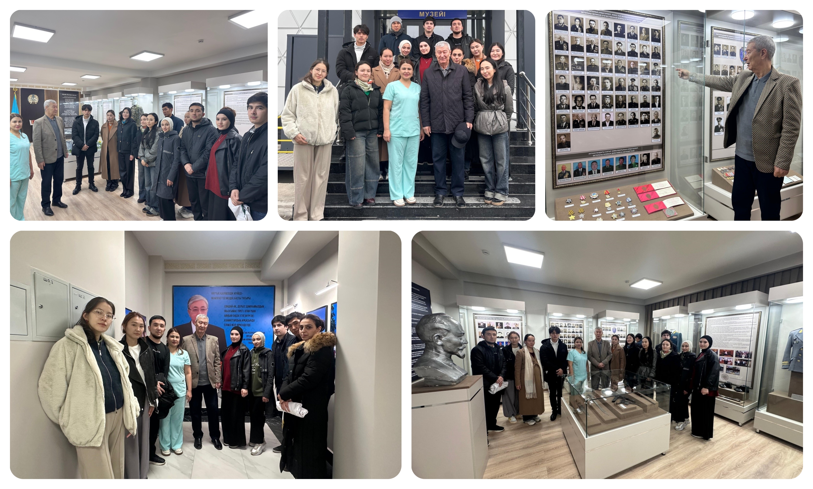 Іс-шараның бастамашысы – кафедра ассистенті, жоғары санатты терапевт-кардиолог Аташова Күмісай Құлдыраққызы ІЖТДО 29-24 және ІТҚ-03-25 топтарының интерн-дәрігерлерімен Алғыс айту күні аясында ел тыныштығы мен бейбіт өмірі жолында еңбек еткен ардагерлерге құрмет көрсетіп, Шымкент қалалық мұражайында тағылымды кездесуге қатысты.Кездесуде қалалық ардагерлер кеңесінің төрағасы,мұражай басшысы Адаев Уәлихан Жолдасбекұлы жас дәрігерлерді мұражай жәдігерлерімен таныстырып, тарих тереңінен сыр шертті. Ол жастарға патриоттық рух беріп, Ұлы Отан соғысы жылдарындағы батырлардың жанқиярлық ерлігі мен сол кездегі барлау қызметінде жаумен шайқасып, Жеңіс күнін жақындатқан қаһармандардың фотосымен таныстырып,олардың ерен еңбегі жәйлі әсерлі әңгіме өрбітті. Сонымен қатар, ел бірлігі мен ұлтаралық татулықты сақтау, Отанға адал қызмет ету жөнінде ақыл-кеңесін айтып, ақ батасын берді.