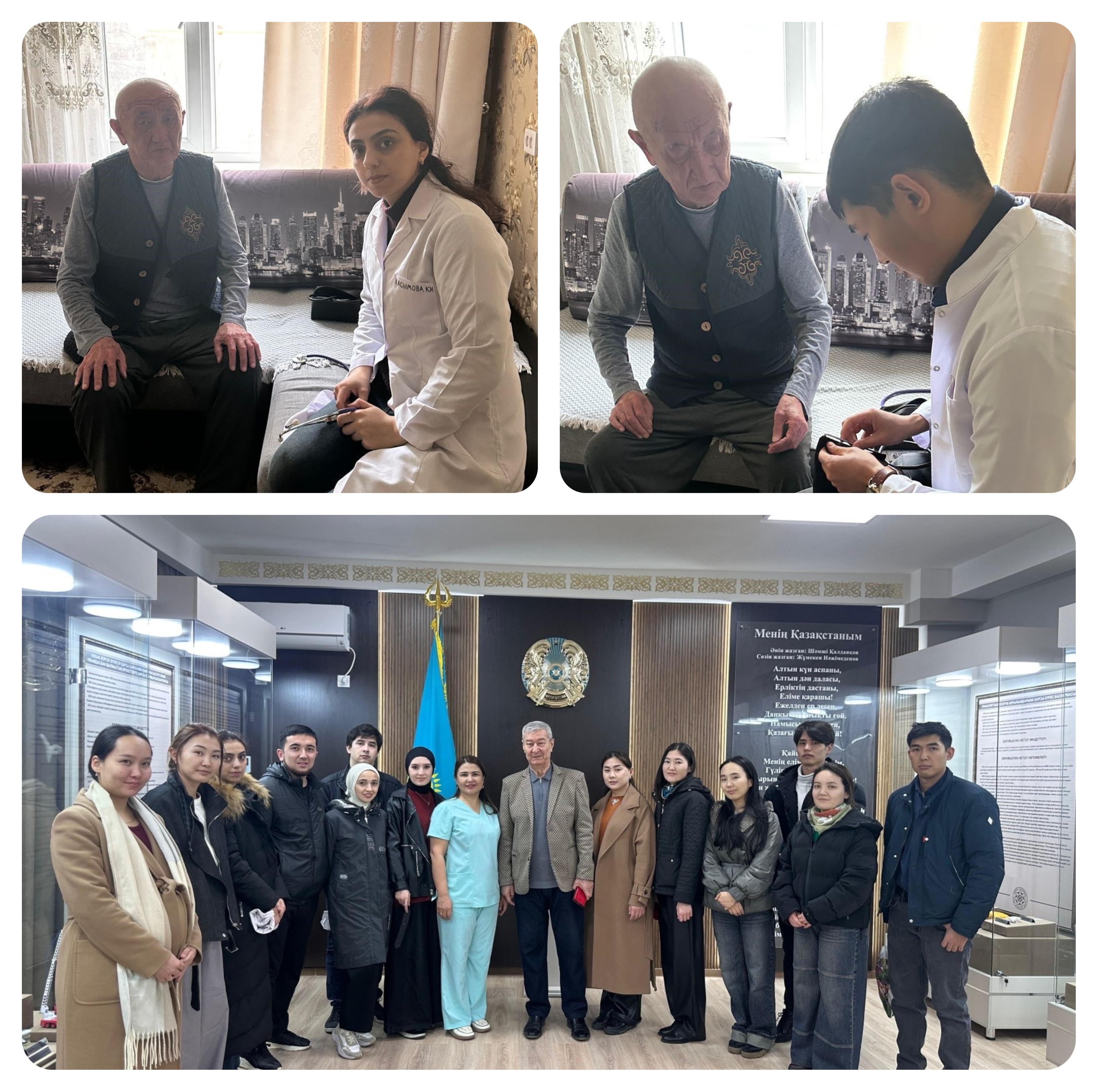 Интерн-дәрігерлер тізім бойынша ардагерлердің шаңырағына арнайы барып, кәсіби медициналық тексеру жүргізді. Қариялардың шағымдары тыңдалып, ауру тарихы зерделенді, қан қысымы өлшеніп, жүрек тондары мен пульс көрсеткіштері тексерілді. Сонымен қатар қабылдап жүрген дәрі-дәрмектеріне талдау жасалып, емдеу шараларына қажетті түзетулер мен ұсыныстар берілді.
