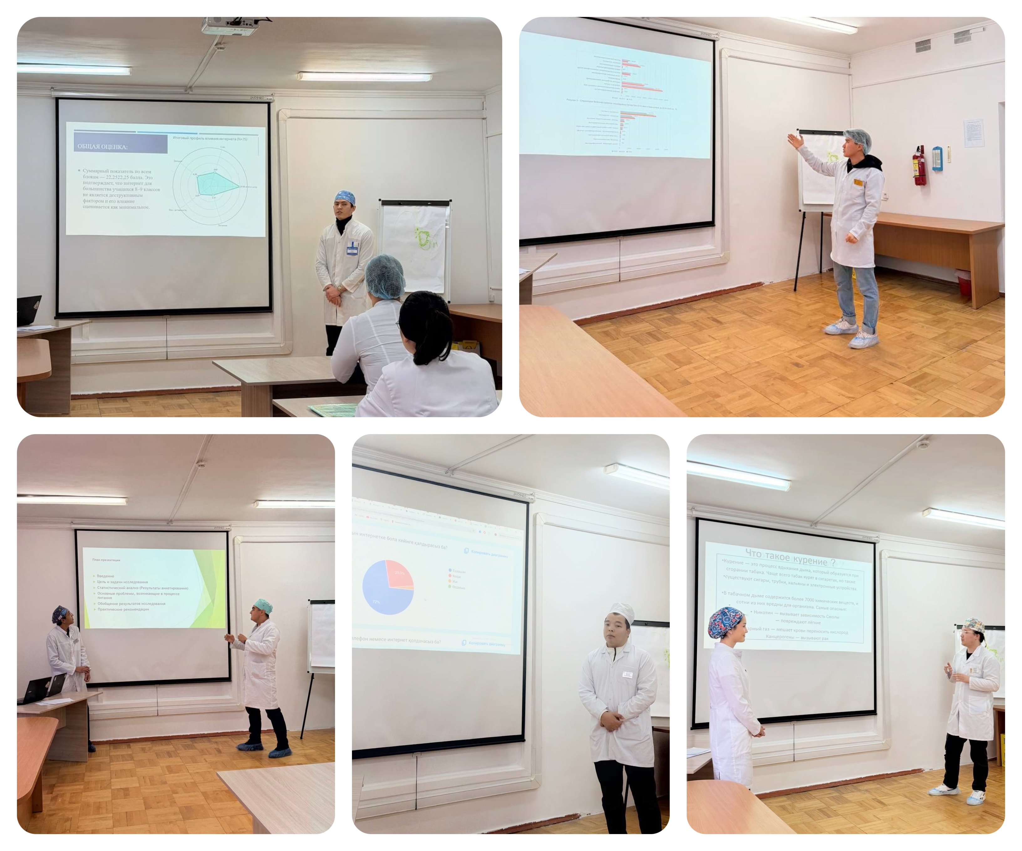 Балалар денсаулығына әсер ететін мінез-құлықтық, әлеуметтік және медициналық факторларды бағалауға ерекше назар аударылды. Әрбір баяндама презентациямен, статистикалық материалдармен және жүргізілген зерттеулердің практикалық маңыздылығын көрсететін қорытындылармен сүйемелденді.