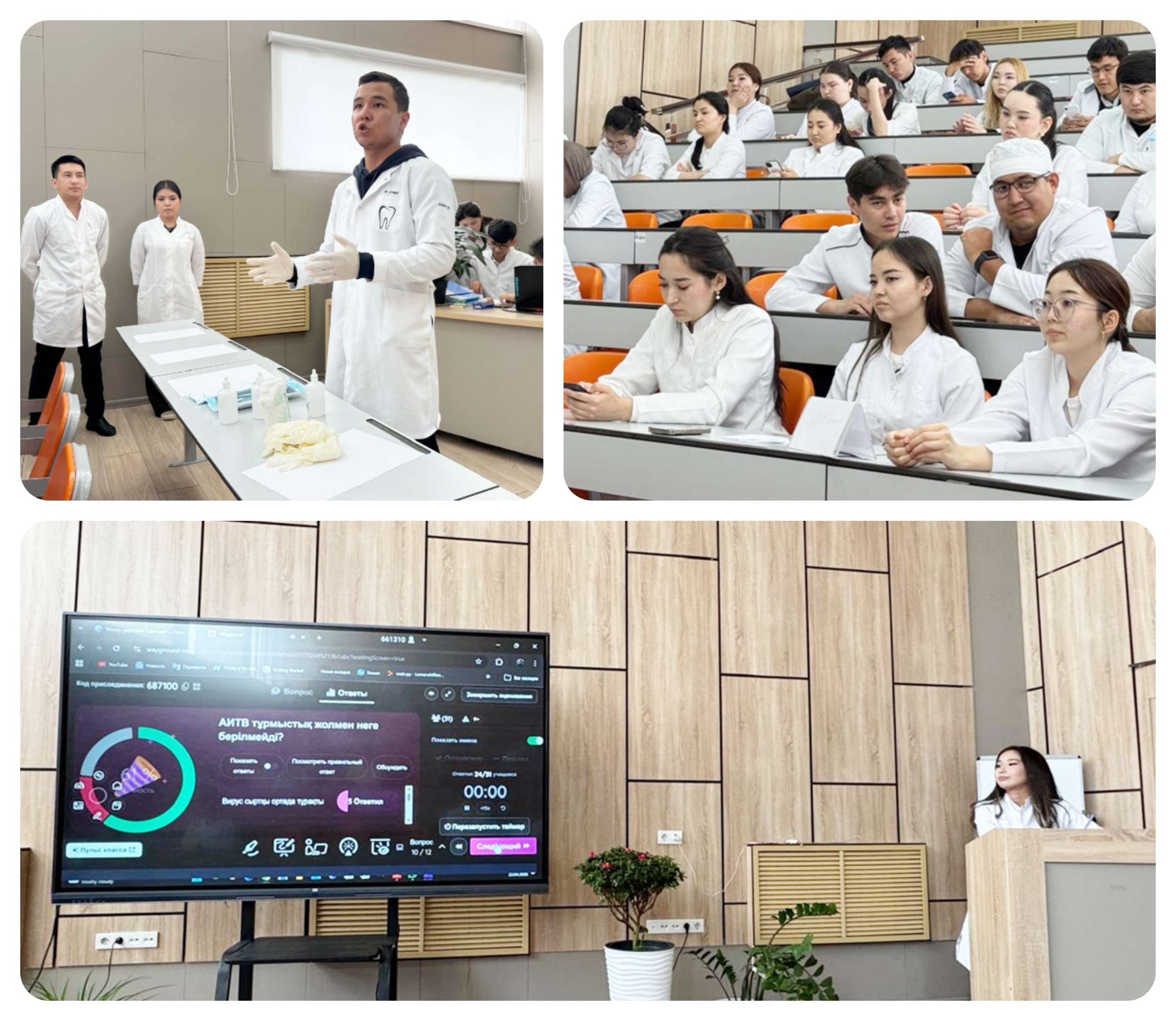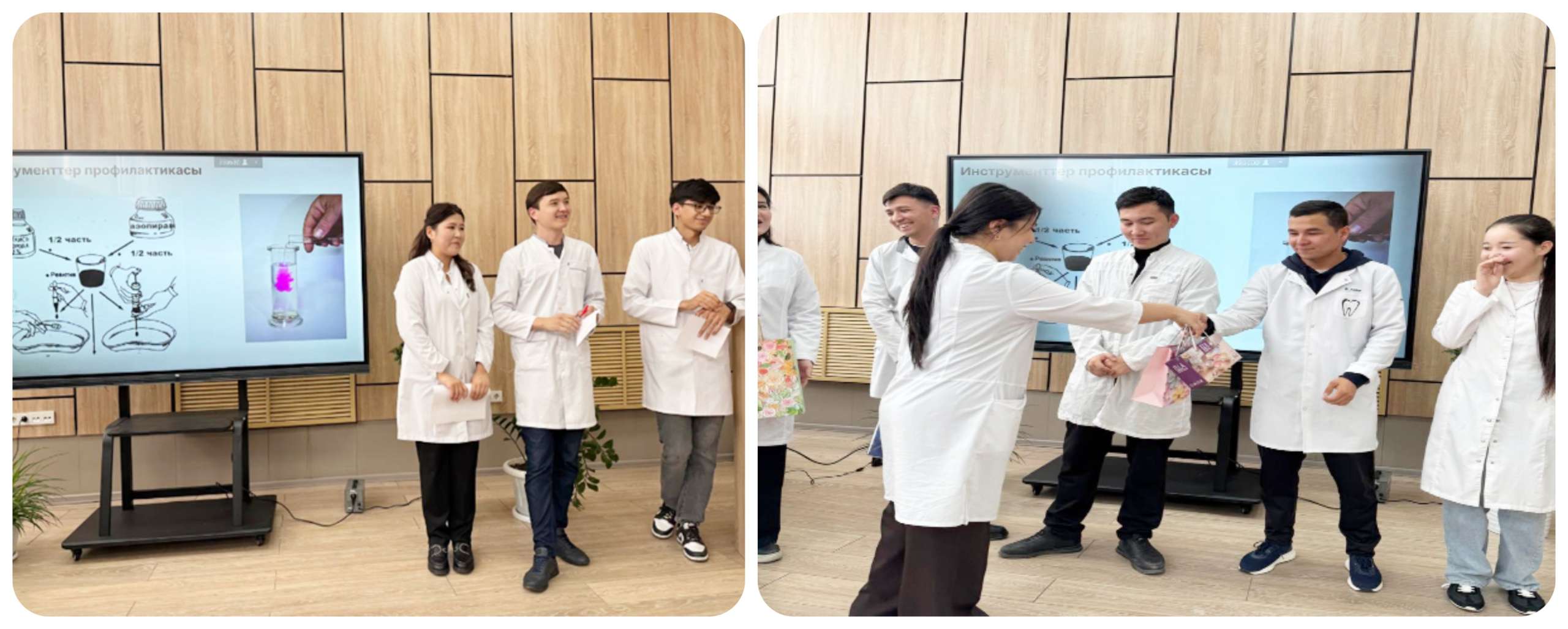 Бекболат Д. білім алушылардың өткен тақырыптардан, сондай-ақ олардың санитариялық-эпидемиологиялық бақылау аясындағы нормативтік актілер бойынша білімдерін анықтау мақсатында санитариялық-эпидемиологиялық түсініктерді жартылай жазып ұсынды, оны команда мүшелері толықтырып жазып, аяқтады. Бұған қоса, командаларға жалпы тәжірибелік дағдыны көрсету ұсынылды, яғни зарарсыздандырылған стоматологиялық құралдардың сапасын бақылайтын азоперам және фенолфталейн сынамаларын жүргізуді көрсету болды. Вирус командасынан СТҚА-02-23 тобының студенті Набиалы А. тәжірибелік дағдыны шығып көрсетті.