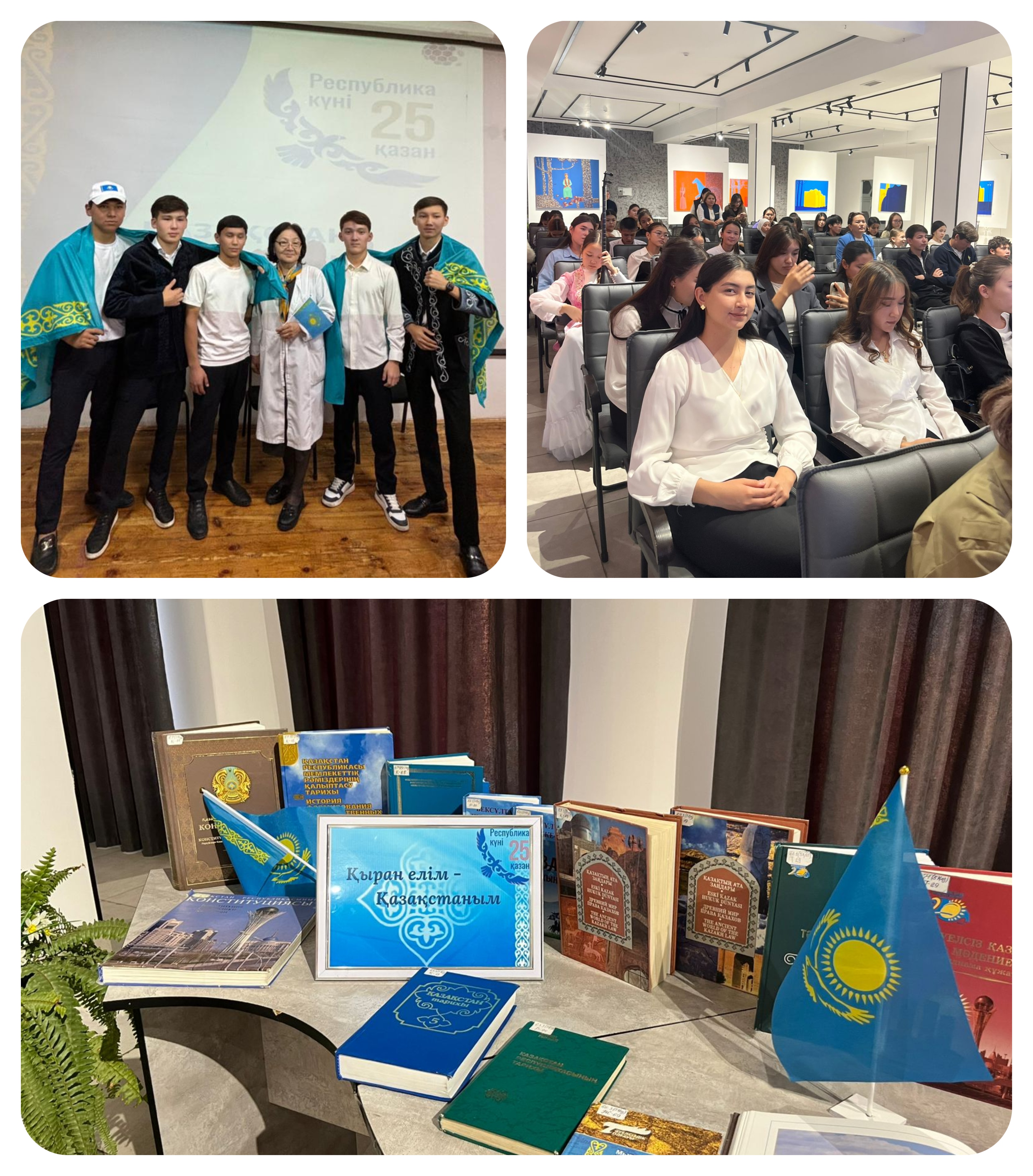 Осы мерекеге орай ОҚМА АҚ жанындағы медицина колледжі Жалпы білім беретін пәндер кафедрасының ұйымдастыруымен Республика күніне арналған « Менің елім-Қазақстан» атты мерекелік іс - шара өткізілді. Мерекелік жиынның шымылдығы Қазақстан Республикасының Мемлекеттік Әнұранымен басталды. Колледжіміздің белсенді білім алушыларының қатысуымен арнайы дайындалған концерттік бағдарлама қойылып, мереке күнінің шығу тарихы жайында видио роликтер көрсетілді. Білім алушылар әуеленген әндерімен, аспапта ойнау өнерлерімен таңғалдыртып іс – шараны «Атамекен» әнімен аяқтады.