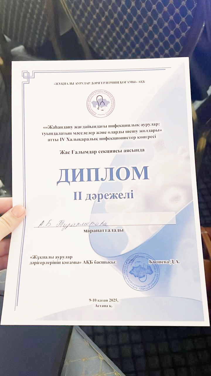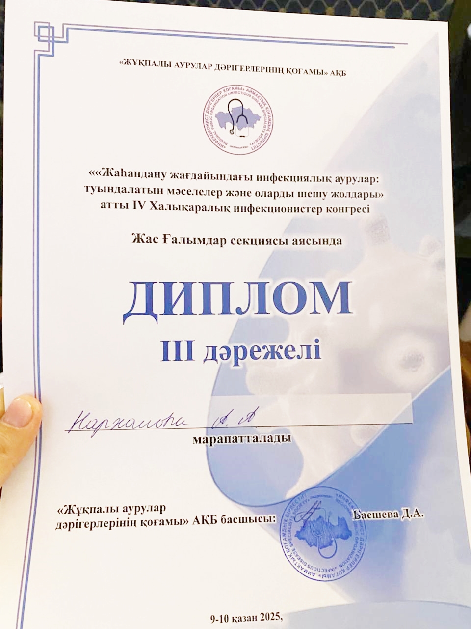 2025 жылғы 9–10 қазан күндері Астана қаласында Қазақстан Республикасы Денсаулық сақтау министрлігінің, «Астана медицина университеті» КЕАҚ және «Инфекционистер қоғамы» республикалық қоғамдық бірлестігінің қолдауымен «Жаһандану жағдайындағы жұқпалы аурулар: сын-қатерлер және шешімдер» тақырыбында инфекционистердің IV Халықаралық Конгресі өтті. Аталған конгресс эпидемиологиялық жағдай, жұқпалы ауруларды диагностикалау мен емдеудің заманауи тәсілдері бойынша ұлттық және халықаралық тәжірибе алмасуға арналған ең ірі ғылыми-тәжірибелік алаңға айналды. Жұқпалы аурулар кафедрасының жас ғалымдары жас зерттеушілер секциясында академия атынан жоғары деңгейде қатысып, өз баяндамаларын ашық тыңдалым форматында ұсынып, кәсіби қауымдастық тарапынан үлкен қызығушылық тудырды. 1-курс резиденті Турахметова А. «Білмеушілік – қауіп факторы ретінде: Қырым-Конго геморрагиялық қызбасының отбасылық жағдайлары» тақырыбындағы баяндамасымен ІІ орынға ие болды.