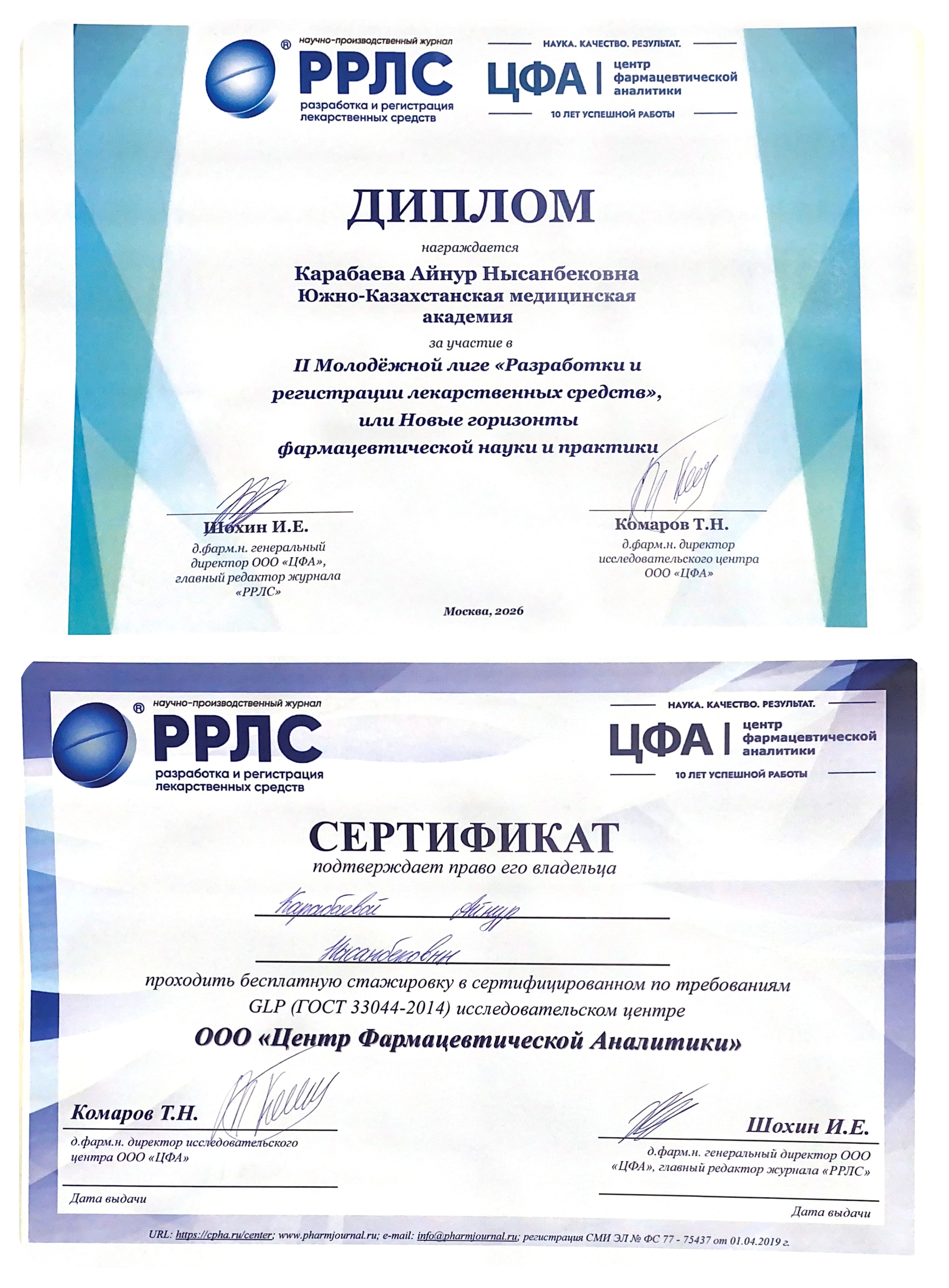 II Жастар лигасының қорытындысы бойынша Қарабаева А.Н. арнайы сыйлыққа ие болып, «Фармацевтикалық аналитика орталығы» ЖШҚ-ның сертификатталған GLP-зерттеу орталығында тегін тағылымдамадан өтуге сертификат алды. Бұл ұсынылған ғылыми жұмыстың жоғары деңгейде бағаланғанын көрсетеді.