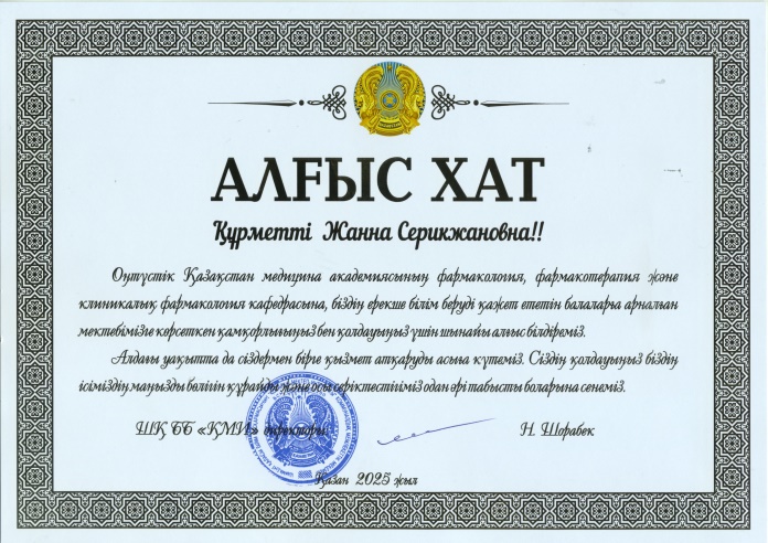 Оңтүстік Қазақстан Медицина академиясы фармакология, фармакотерапия және клиникалық фармакология кафедрасы тәрбие жұмысы жоспары аясында ерекше балаларға арналған Шымкент қосалқы мектеп-интернатында қайырымдылық іс-шарасын ұйымдастырып, белсенді түрде ат салысты. Іс-шараға ФҚО 01-25 (2 курс), ФҚҚ А 01-25 (2 курс), ФҚО 02-24 (3 курс), ФҚҚ Б 01-25 (2 курс), ФҚҚ 01-24 (3 курс) топтары қатысты.