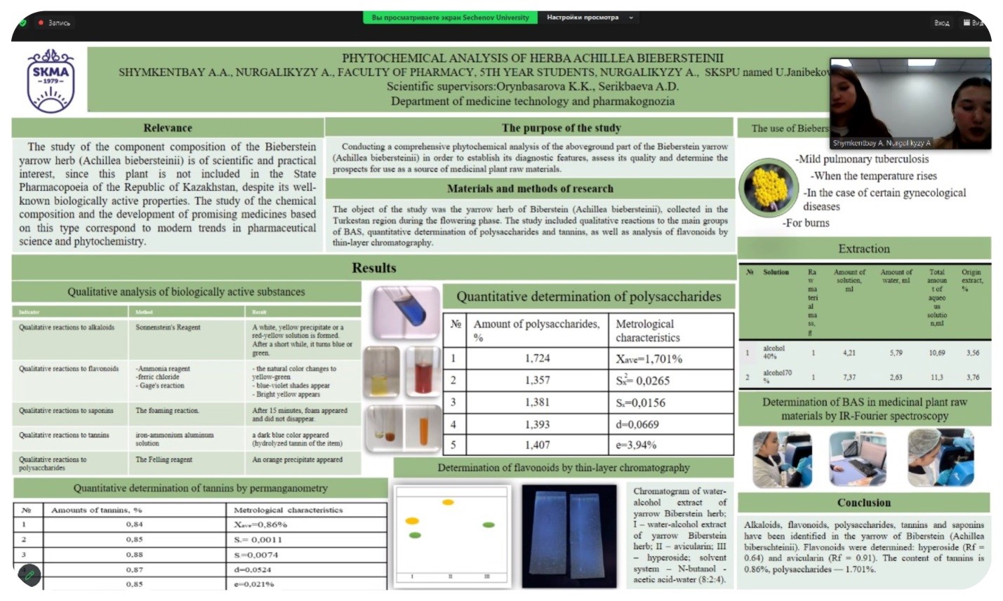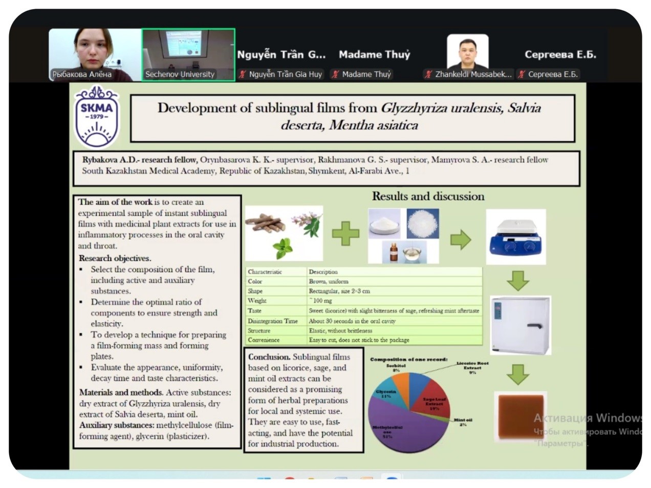˗ Рыбакова А.Д. ағылшын тілінде "Glyzzhyriza uralensis, salvia deserta, mentha asiatica-дан sublingual films Development of Sublingual films"атты постерлік баяндама жасады.