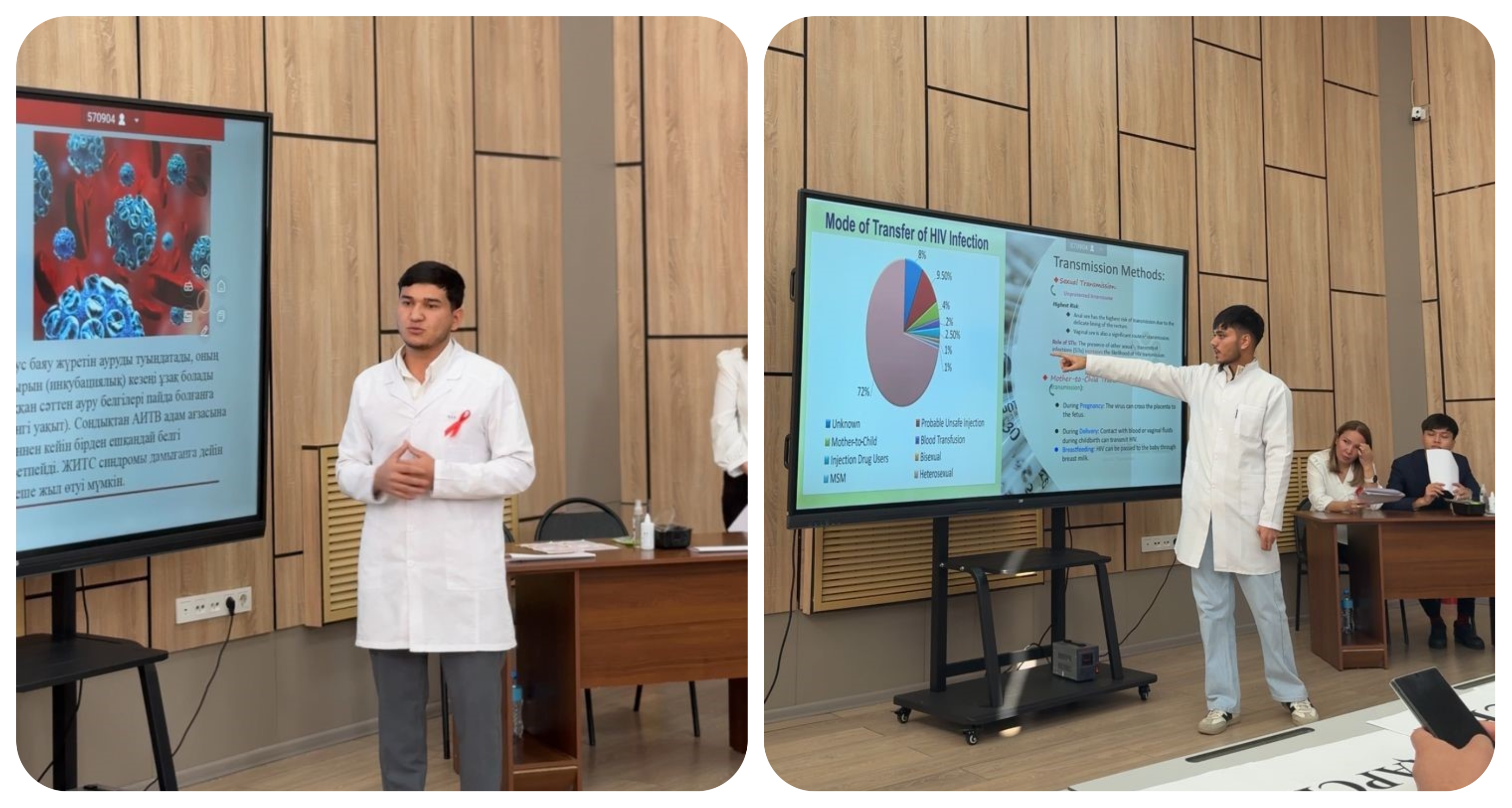 ВМ-МҚқА -01-24 пен ВМ- МША-05-23 тобының білім алушылары Х. Рахманқұлов пен Yahya Nazir АИТВ инфекциясы, жұғу жолдары мен алдын алу шаралары, ерте тексерілудің маңызы туралы дайындаған презентацияларымен көпшілікті таныстырды.