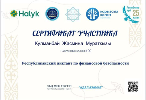 Қазақстан республикасы қаржылық мониторинг агеттігі 10-20 қазан аралығында «Қаржылық қауіпсіздігі» бойынша Қазақстан заматтары арасында диктант жазу шарасын өткізді. Осы іс-шараға Оңтүстік Қазақстан медицина академиясы , қазақ, орыс және латын тілдері кафедрасы оқытушылары да өз тәлімгерлік топтарымен бір кісідей атсалысты. Кафедра аға оқытушысы Шадиева Қ.Б тәлімгерлік ФҚАБ-01-25 топ студенттерімен түгел қатысып, сертификат және дипломдар иеленді. Іс- шарада әрбір азаматтың қаржылық сауатылығын арттыруға көлемді көмегін тигізу мақсаты көзделген