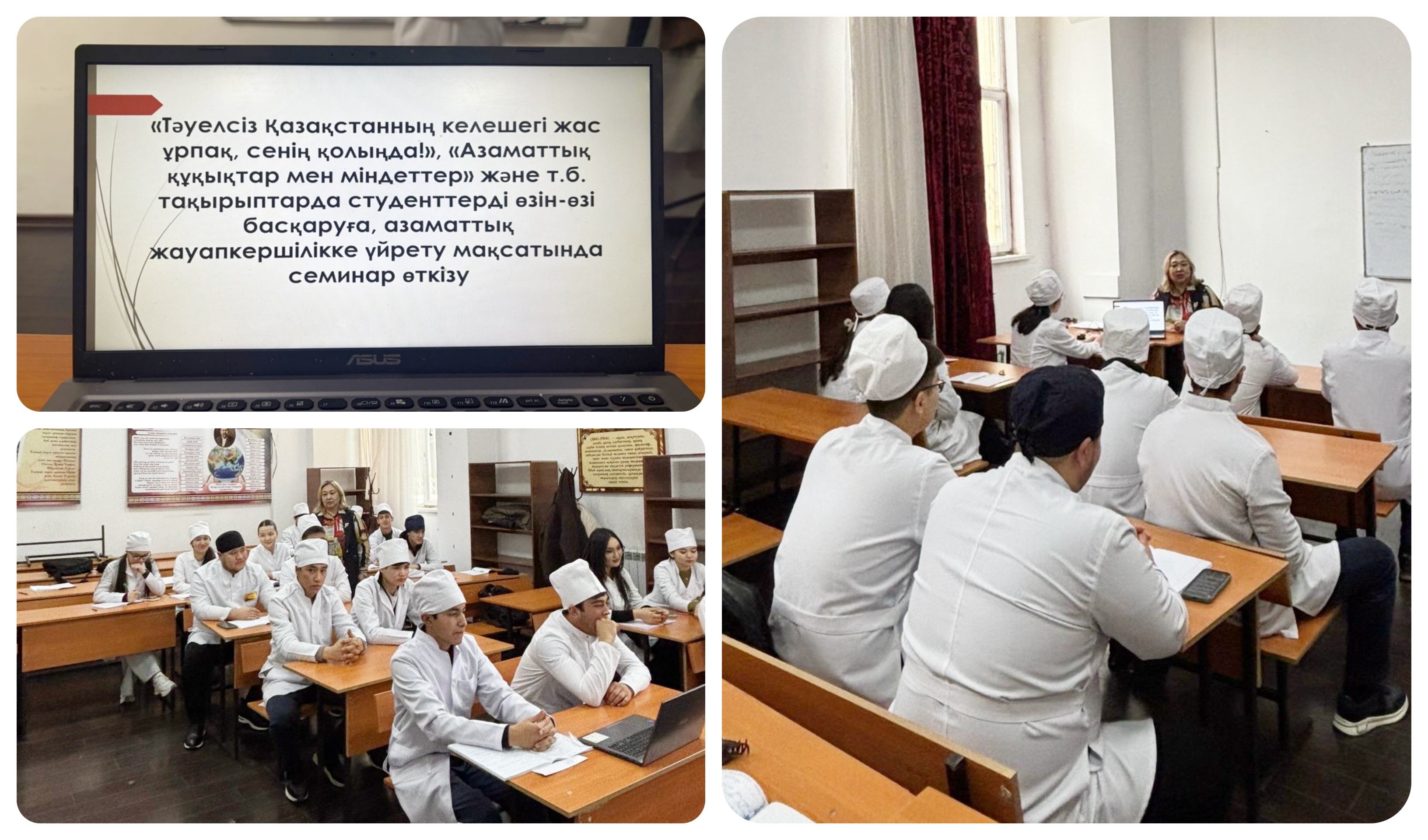 «Қазақстан тарихы және әлеуметтік-қоғамдық пәндер» кафедрасының доцент міндетін атқарушы Г.С.Айдарбекованың ұйымдастыруымен «Парасат» үйірме мүшелерінің қатысуымен «Тәуелсіз Қазақстанның келешегі – жас ұрпақтың қолында!»,«Азаматтық құқықтар мен міндеттер» тақырыбында тәрбие жұмыстарын ұйымдастыру жөнінде іс-шара өткізілді. Мақсаты - білім алушылардың азаматтық сана-сезімін қалыптастырып, олардың құқықтық сауаттылық деңгейін арттыру, өзін-өзі басқару дағдыларын дамыту арқылы жастардың ел дамуына қосатын үлесін терең түсіндіру және азаматтық жауапкерілік пен патриоттық сезімін нығайту болып табылады. Дөңгелек стол барысында студенттерге азаматтық қоғам ұғымы, белсенді азаматтық ұстанымның мәні және жастардың ел болашағын қалыптастырудағы рөлі жан-жақты баяндалды. «Азаматтық құқықтар мен міндеттер» тақырыбы аясында Қазақстан Республикасының Конституциясы негізінде азаматтардың негізгі құқықтары мен заң алдындағы міндеттері түсіндіріліп, құқық пен міндеттің өзара байланысы нақты мысалдар арқылы көрсетілді. Заң талаптарын сақтау, қоғамдық тәртіпті құрметтеу, Отанға адал қызмет ету – әрбір азаматтың борышы екендігі ерекше айтылды. Өткізілген іс шара тәрбиелік және танымдық тұрғыдан өзекті әрі нәтижелі болды. Студенттердің құқықтық сауаттылығы артып, өзін-өзі басқару жұмыстарына қызығушылығы күшейді. Кафедрада алдағы уақытта осы бағыттағы іс-шараларды жүйелі түрде жалғастыру, азаматтық-құқықтық мәдениетті қалыптастыруға арналған кездесулер мен тренингтер ұйымдастыру жоспарлануда.