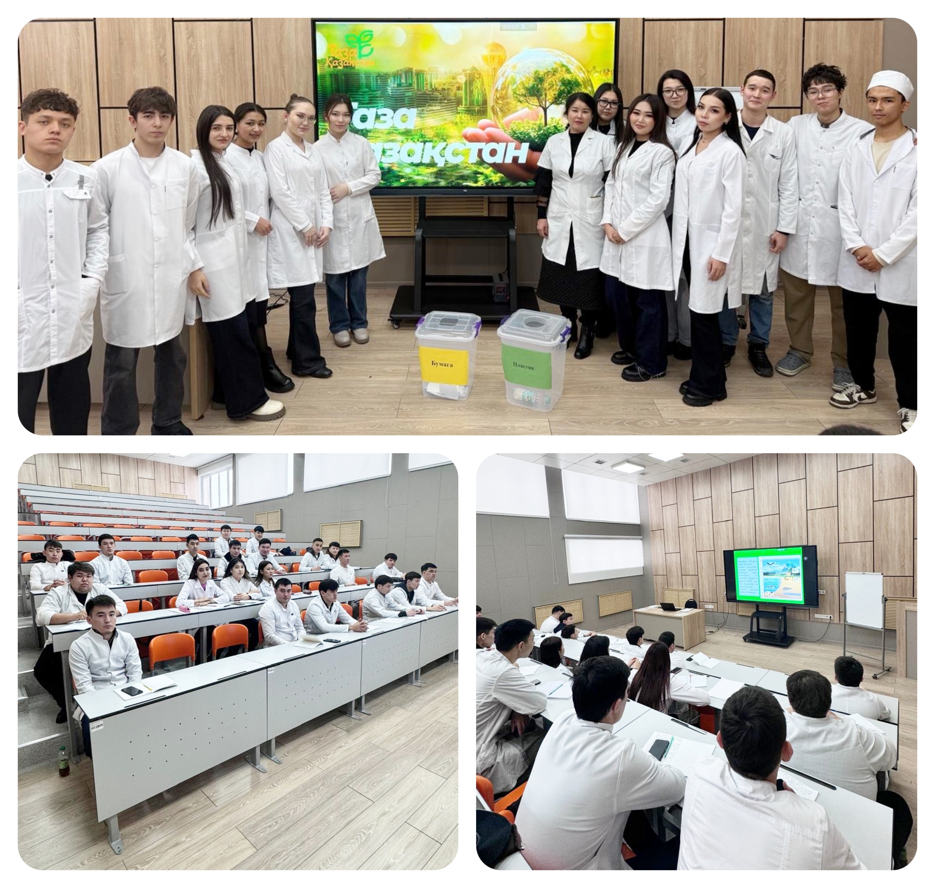 Қоғамдық орындардағы тазалық пен қоршаған ортаны сақтау мәдениетін қалыптастыру мақсатында Гигиена және эпидемиология кафедрасының аға оқытушысы Жақсыбаева Ж.Б ұйымдастыруымен экологиялық сауаттылықты арттыру аясында Медицина ВМ- МО-13 тобының білім алушыларымен кафедрадағы қоқыс қалдықтарына арналған жәшіктер жасалынды. «Таза Қазақстан» – бұл елімізде экологиялық мәдениетті қалыптастыруға, қоршаған ортаны қорғауға және халықтың өмір сүру сапасын жақсартуға бағытталған ұлттық бастама. Іс-шараның мақсаты-білім алушылардың экологиялық мәдениетін дамыту және табиғатты қорғау ісіне үлес қосуға мүмкіндік беру.