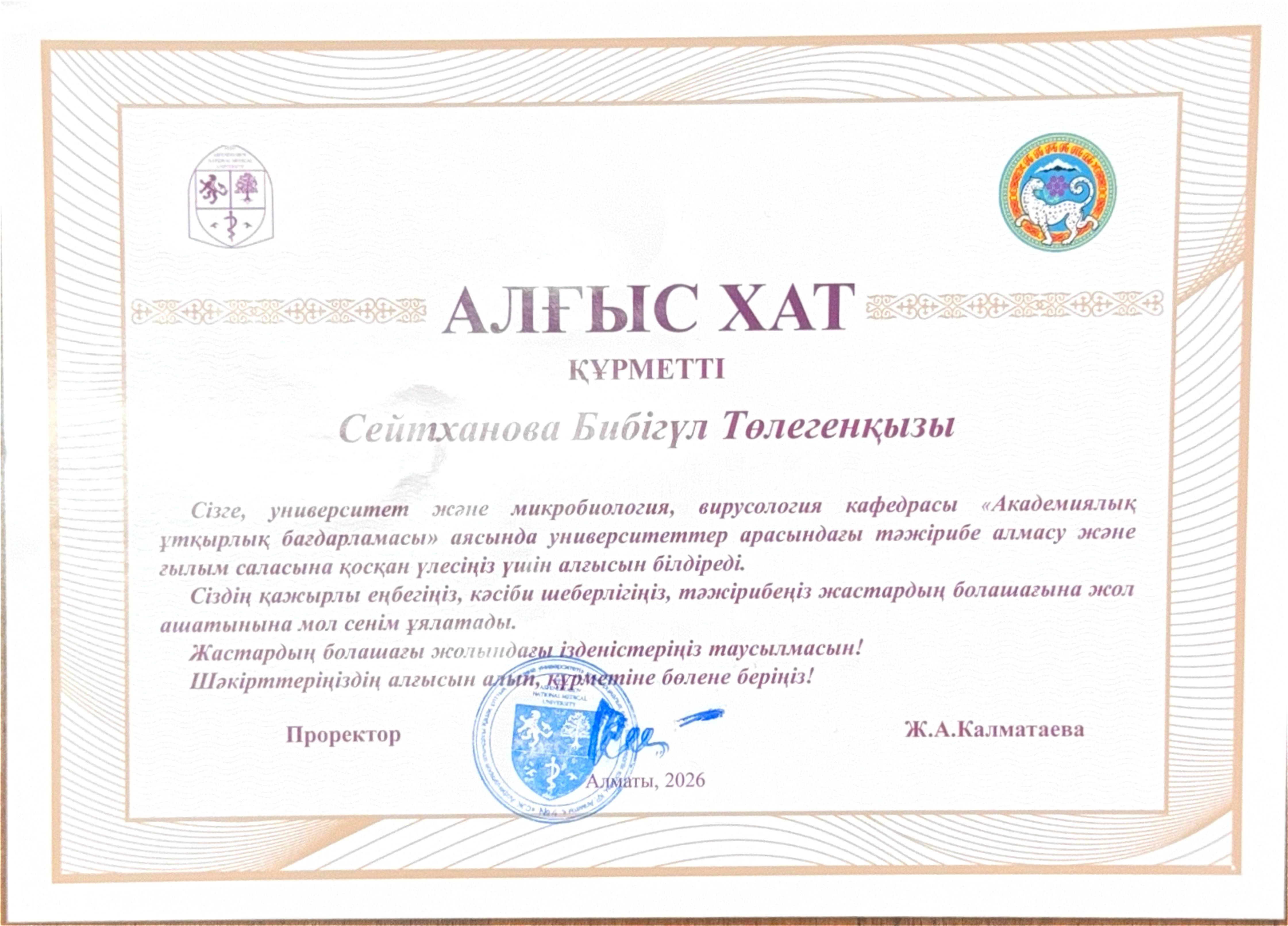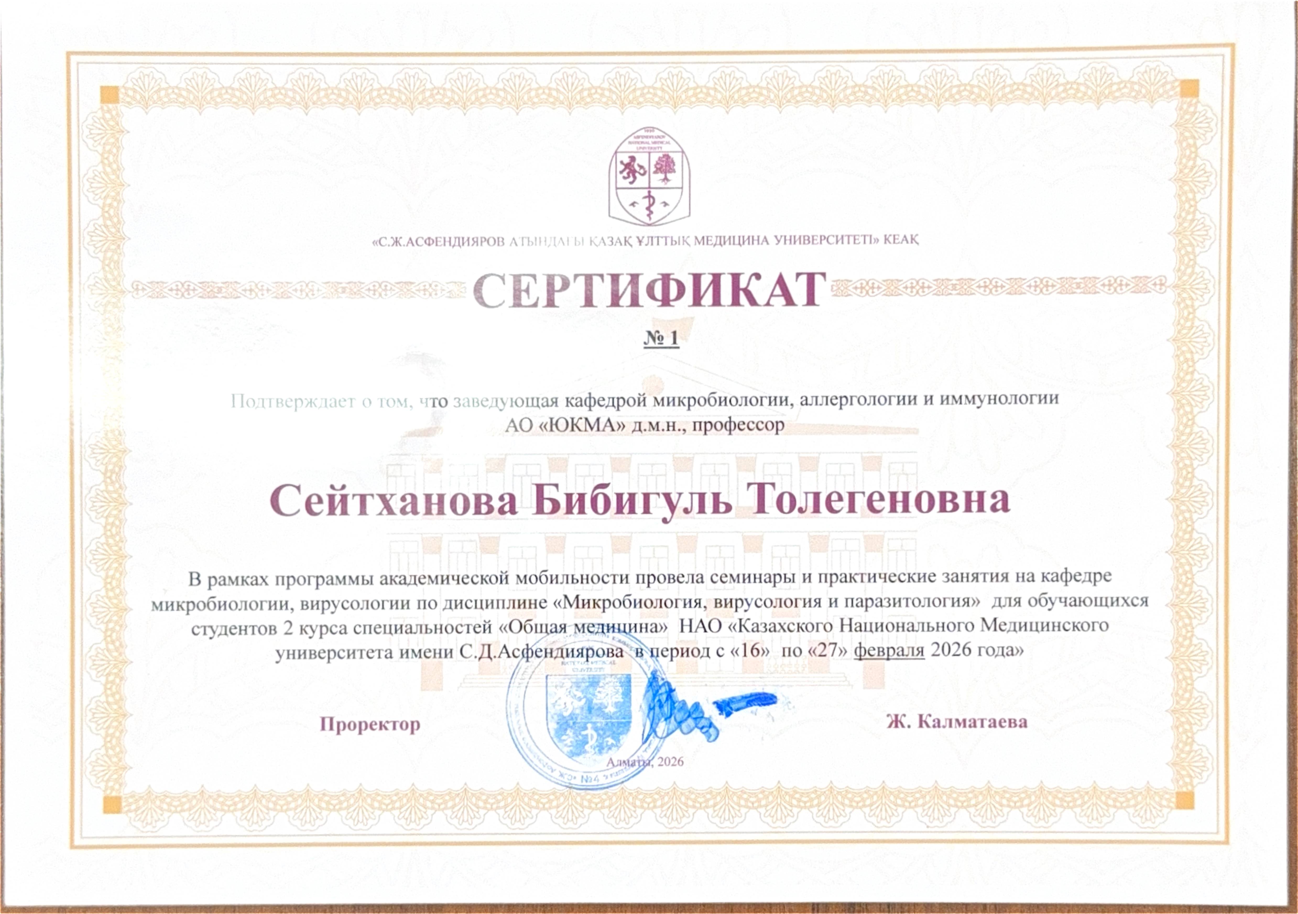 2026 жылдың 16–27 ақпан аралығында С.Д. Асфендияров атындағы Қазақ ұлттық медицина университеті базасында академиялық ұтқырлық бағдарламасы аясында «Жеке микробиология, вирусология және паразитология» пәні бойынша оқу-әдістемелік жұмыстар жүргізілді.