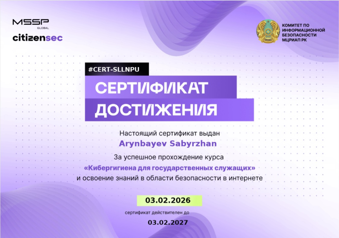 Компьютерлік тестілеу және баспахана орталығы (КТБО) жанынан 01.10.2025ж №157-ө бұйрығымен "Киберқауіпсіздік және ақпараттық қауіпсіздікті қорғау" маманы ашылды.