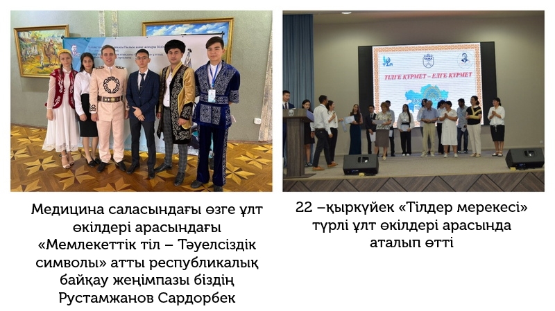 Қазақстан Республикасының Ғылым және жоғары білім министрлігі Тіл саясаты комитеті Шайсұлтан Шаяхметов атындағы «Тіл-Қазына» ұлттық ғылыми-практикалық орталығы ұйымдастырған медицина саласындағы өзге ұлт өкілдері арасындағы «Мемлекеттік тіл – Тәуелсіздік символы» атты Қарағанды қаласында өткізілген республикалық байқауда медицина факультетінің 2 курс В-ПО-03-21 тобының студенті Рустамжанов Сардорбек Тахиржанович 1 орын иеленіп қайтты