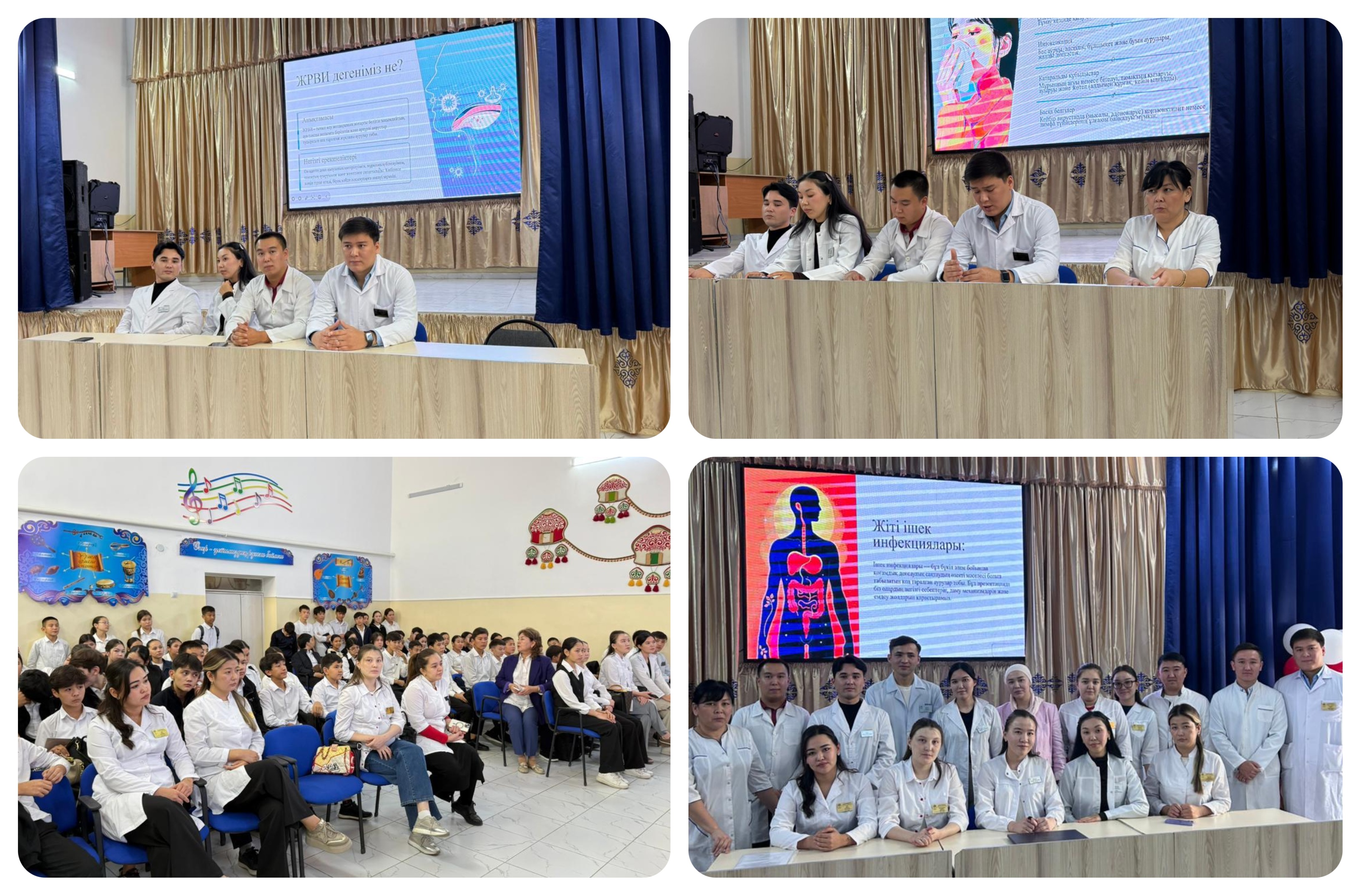 С этой целью под руководством заведующего кафедрой «Семейная медицина» Кауызбая Жумалы Арипбайулы и ассистента кафедры Тажиевой Айгуль Дюйсебековны врачи-интерны 7 курса групп ІЖДТҚ-13-24 и ІЖДТҚ-14-24 провели познавательную лекцию для учеников 7, 8 и 9 классов средней общеобразовательной школы № 78 на тему «Первые клинические проявления инфекционных заболеваний и их профилактика».