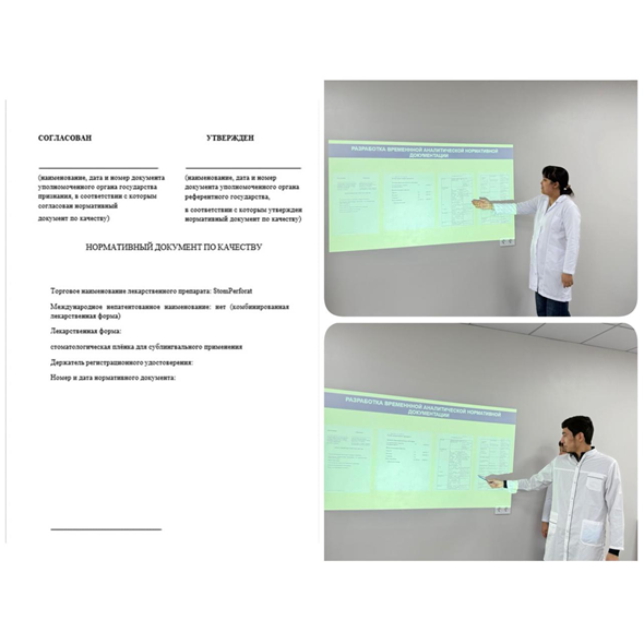 На втором этапе были разработаны методики исследований и проведены экспериментальные исследования. В частности, определены качественные показатели стоматологических пленок, изготовленных на основе экстракта зверобоя продырявленного. Для идентификации и количественного определения биологически активных веществ применялись качественные реакции, метод тонкослойной хроматографии, титриметрический анализ, а также методы ИК-спектроскопии, УФ-спектрофотометрии. Кроме того, были определены фармакопейные показатели качества стоматологических пленок. Все исследовательские работы выполнены в учебно-научной аудитории кафедры фармацевтической и токсикологической химии.