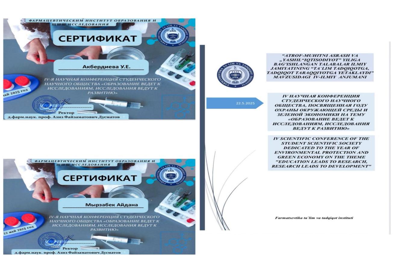 Результаты проекта апробированы на международном уровне. В частности, обучающиеся приняли участие на IV научно-практической конференции студенческого научного общества учебно-исследовательского фармацевтического института (г. Ташкент) и выступили с научным докладом.