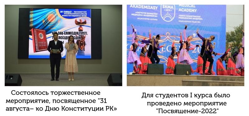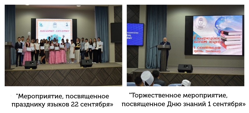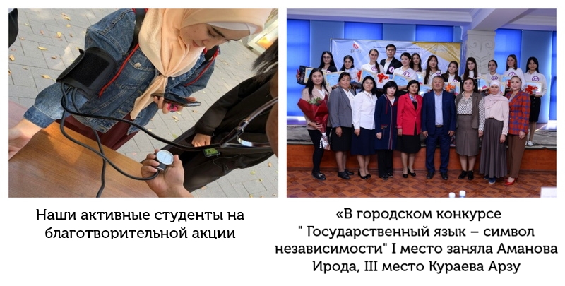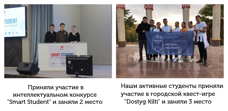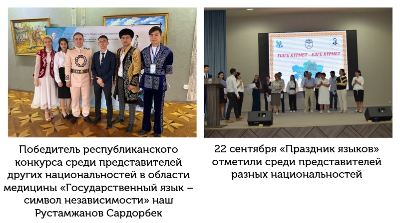 Шымкентским городским учебно-методическим центром языков был организован городской конкурс «государственный язык-символ независимости» с целью расширения сферы применения государственного языка, укрепления деятельности казахского языка как языка межэтнического общения, стимулирования представителей других национальностей, владеющих государственным языком. В конкурсе приняли участие студенты 1 курса группы В-ПО-02-22 медицинского факультета ЮКМА Кураева Арзу Руслановна и Аманова Ирода Мирмаксудовна, І место заняла Аманова Ирода, ІІІ место Кураева Арзу и награждены ценными призами
