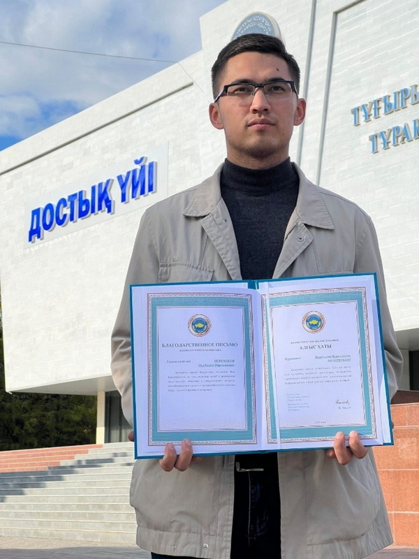 25 октября в канун «Дня Республики» За доблестный труд председатель Шымкентской городской «ассамблеи молодежи», студент 3 курса группы ЖМО-09-20 Мейрбеков Нурболат Нургалиевич награжден благодарственным письмом от имени Президента Республики Казахстан, Председателя Ассамблеи народа Казахстана Касым-Жомарта Кемелевича Токаева