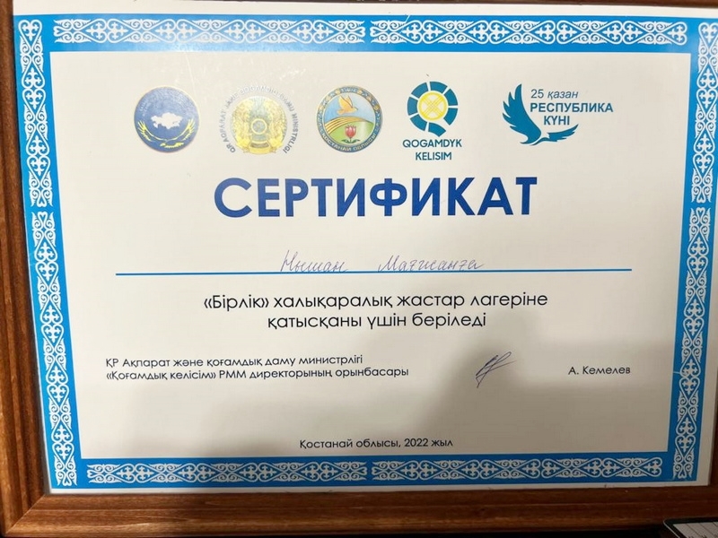 Студент 3 курса группы ЖМҚБ-01-20 Нышан Магжан, принявший участие в Международном молодежном лагере "Бірлік", награжден благодарственным письмом от КГУ «Қоғамдық келісім " Министерства информации и общественного развития РК